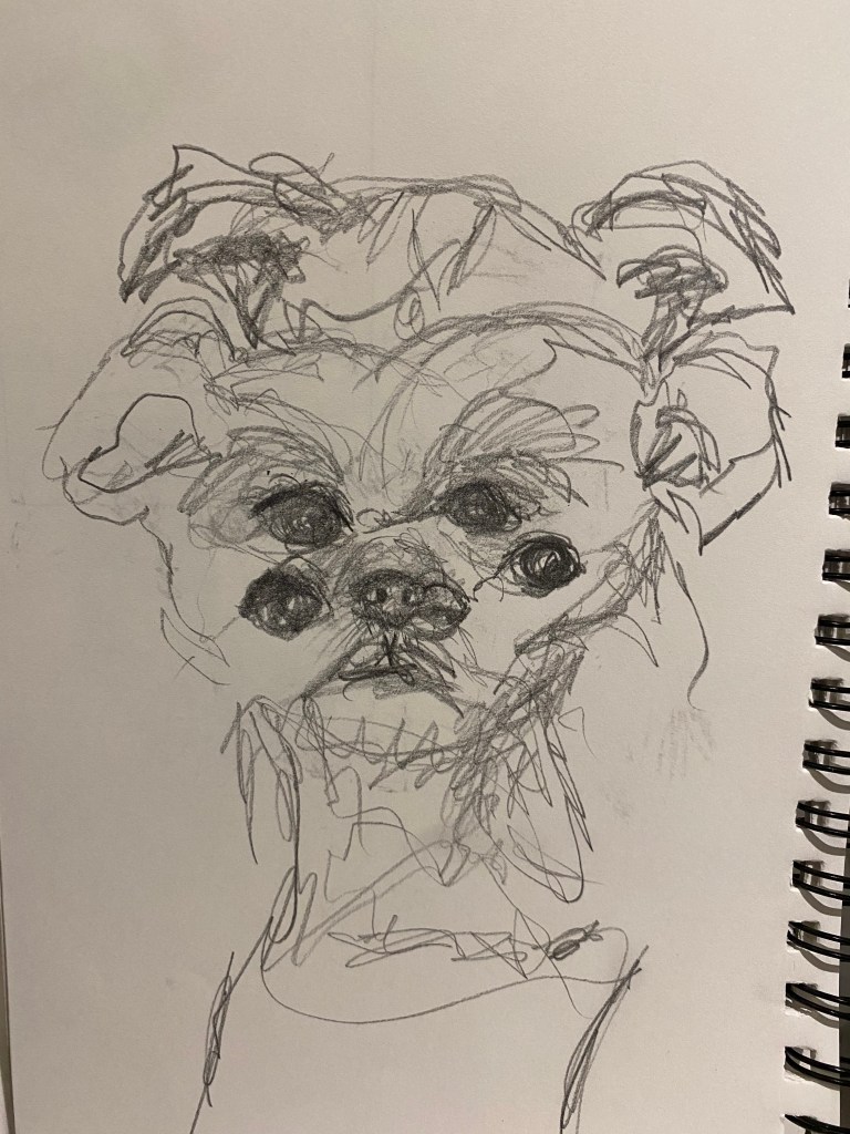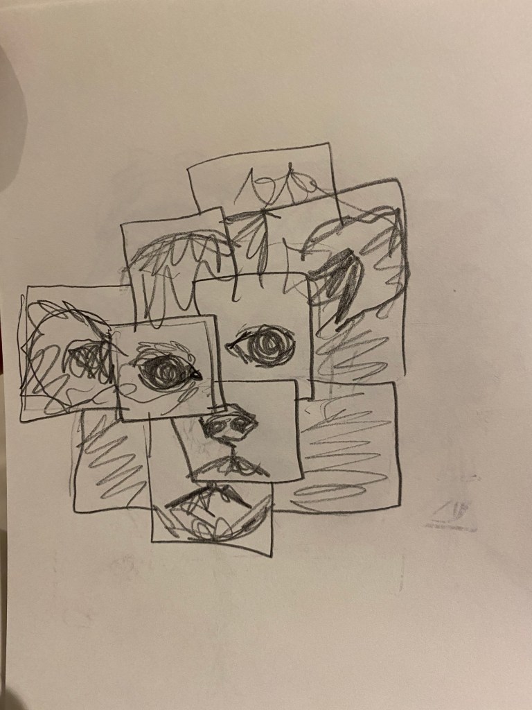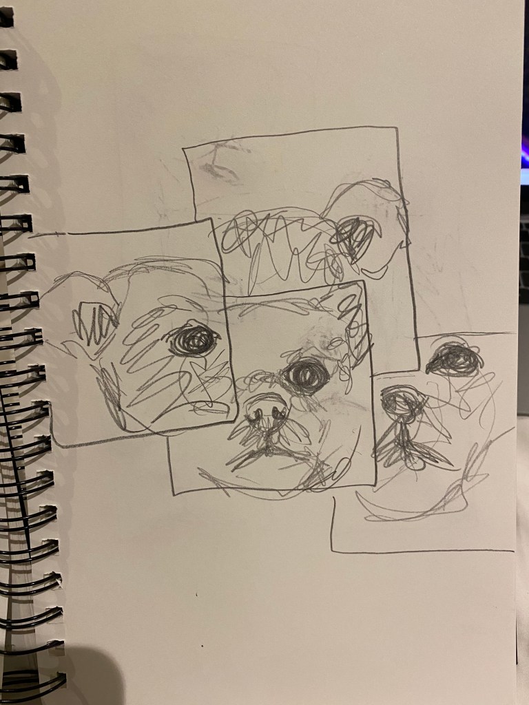 For my concept I would like to do a portrait of my dog in the style of David Hockney. I want to put different perspectives together to form an interesting looking, cubist portrait. These sketches show my different ideas for how I might want to lay out the images and how zoomed in or zoomed out I want them to be.