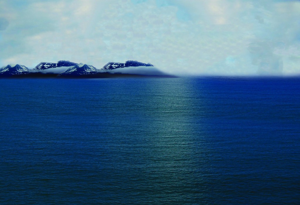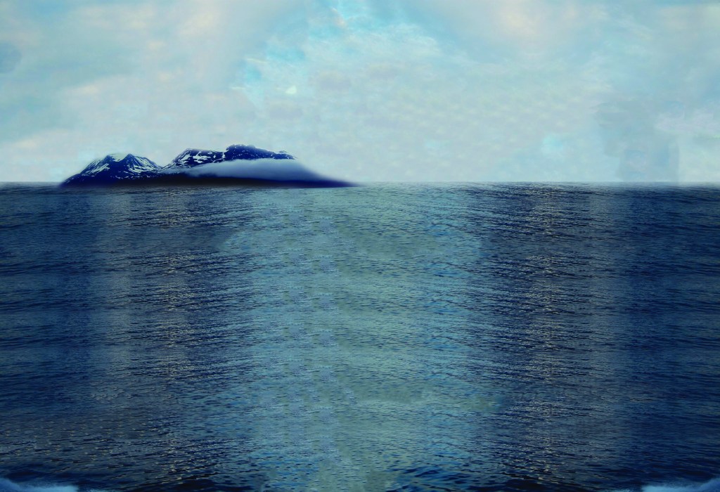 In this first progress image, I took the original background and cropped out the mountains and pushed them off to the side by selecting them out of the background and moving them over. The image itself was too small to fit the page so I had to paste multiple copies for it to fit, and I blended the copies together with the spot healing brush tool. I then made it so that the water went higher up and took up more space in the composition and I used the same technique of copying and pasting and blending to do so. Although I didn’t like how the water looked because you could see the lines of where each image starts and ends.