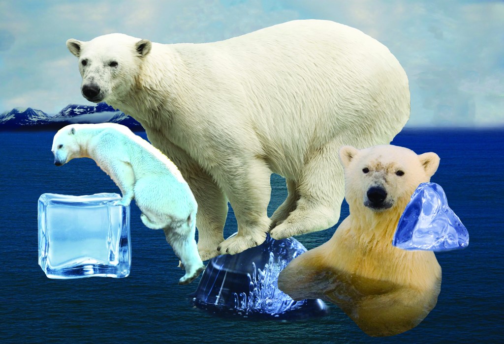 Lastly, I moved and sized all of my images to how I wanted them to look using the transform tool. I used paths to make the bears look more like they were actually in that environment. For the polar bear in the center, I used the puppet warp tool to reshape the bear to make it look like he is actually standing on the ice cube. I also used the layer modes to make it so that the ice cubes and bears looked like they were really in the water.