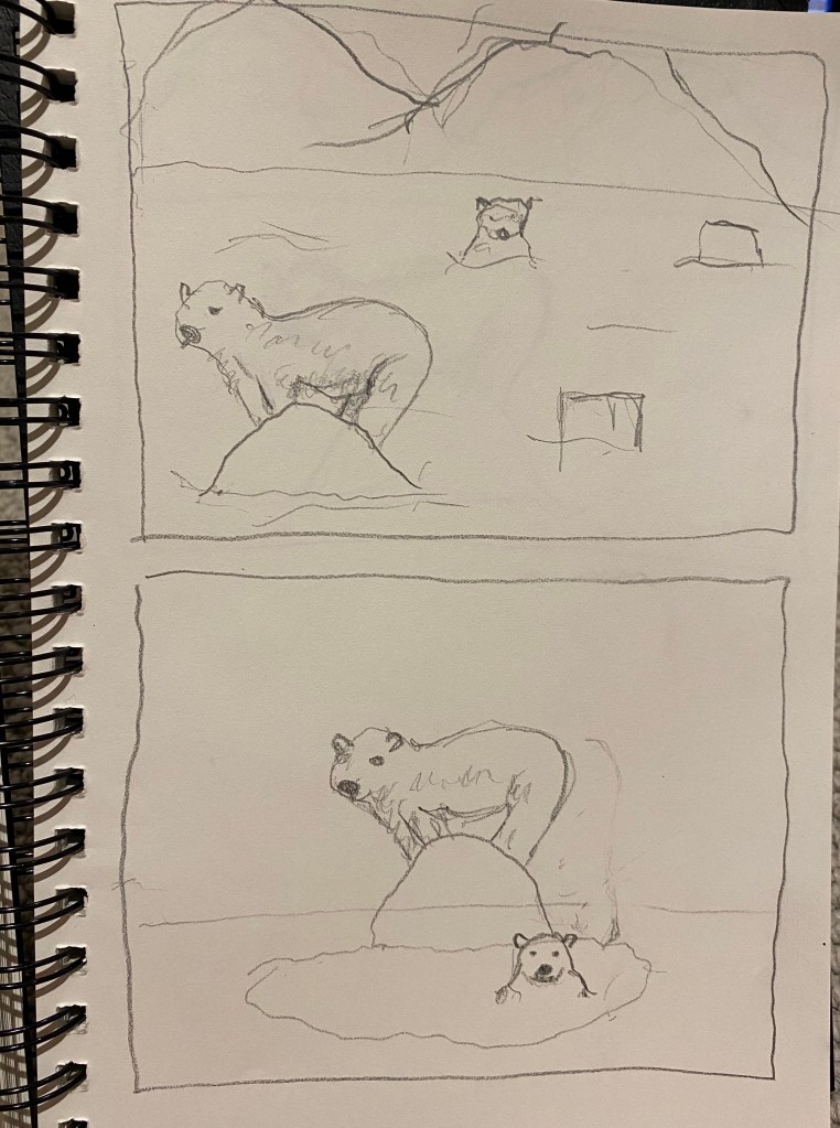 These two sketches are almost identical but one is more zoomed in then the other. Out of the two I would choose the more zoomed in one so that the polar bears and ice cubes stand out more.